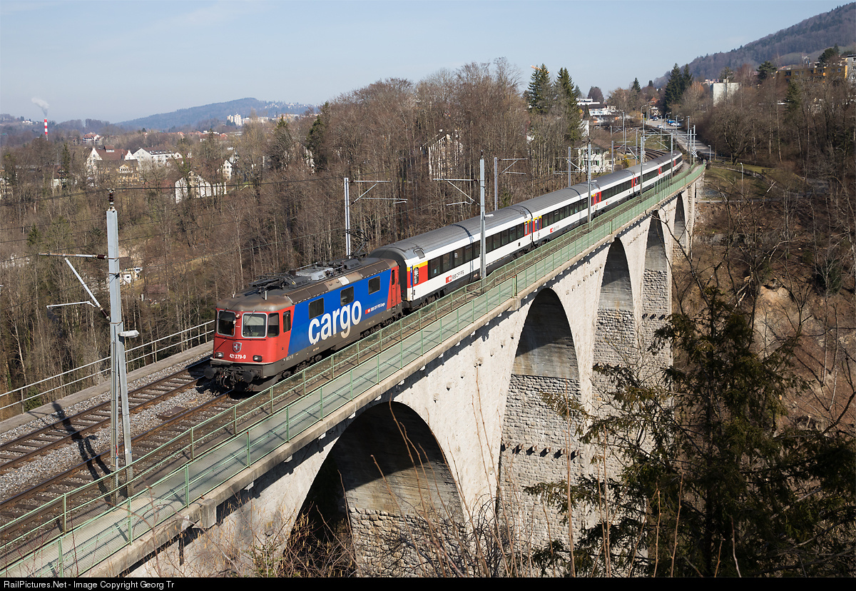 | Re 421 # 379 of SBB Cargo, hired by the passenger division, is pulling Inter Regio 2272 St.Gallen-Basel between St.Gallen and Zürich, crossing the 63 meter high Sitter viaduct between St.Gallen Bruggen and St.Gallen Winkeln. |