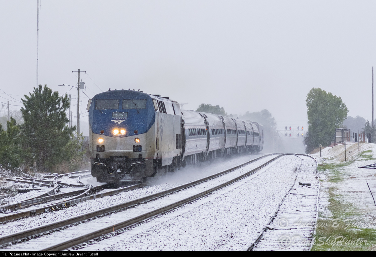 | A late season snowstorm makes an appearance in North Carolina after a very mild Winter. Amtrak 80 crests the grade as it heads downhill to its next scheduled stop in Raleigh. |