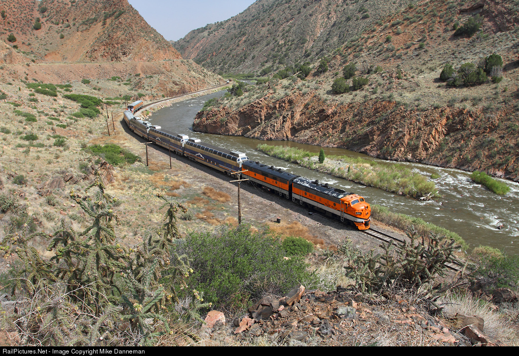 A short six-car Canon City and Royal Gorge Railway passenger train enters the Royal Gorge just east of the old Gorge siding location between Burnito and Gorge, Colorado, on June 2, 2011. EMD F7A No. 403 is former Chicago and North Western No. 4079C built in 1949, while trailing F7B No. 1503 is a former Alaska Railroad unit of the same number.