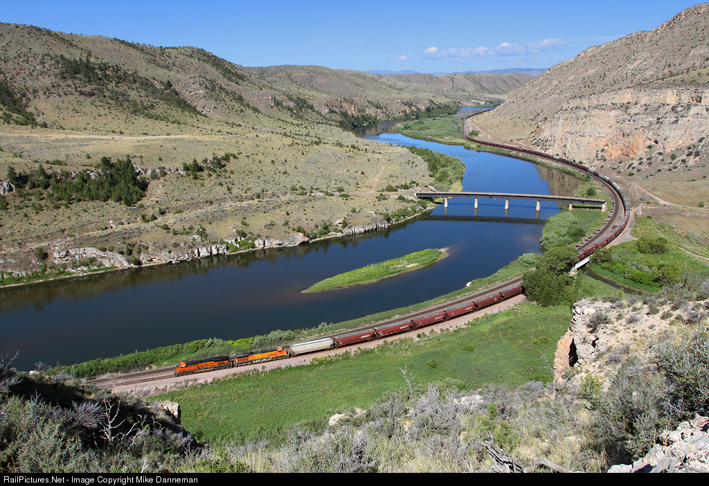 An eastbound BNSF grain train curves along the Missouri River through Lombard, Montana, on the morning of June 23, 2015. The train is passing the abandoned remains of Milwaukee Road’s Pacific Extension bridge over the river, as well as crossing a bridge over Sixteen Mile Creek where it flows into the Missouri.