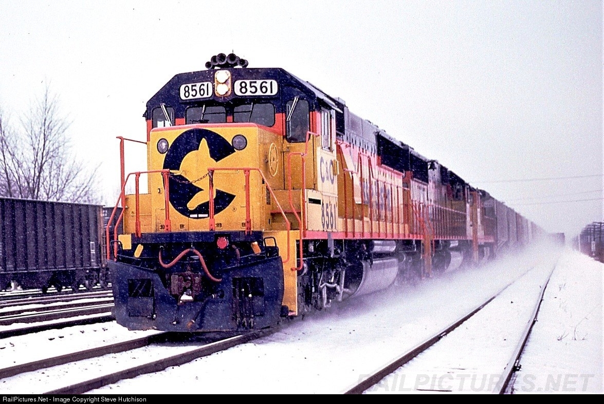 A very clean 8561 leads a trio of Chessie power kicking up the snow as it hustles an eastbound freight through St. Albans, WV. 8561 was delivered new less than a year prior to this photo.
