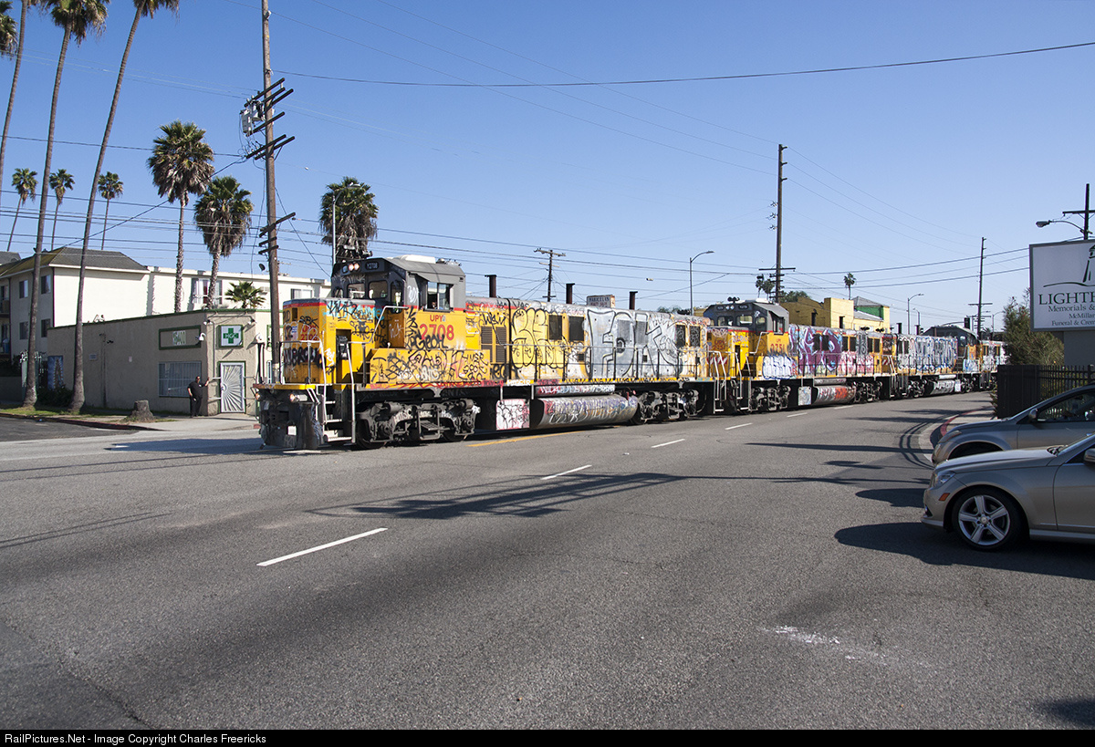 | The Torrance Local passes over the street running in downtown Gardena. Although much of the power is cut off, this train had an unusual seven units. Maybe the 'extra' paint required additional power. |