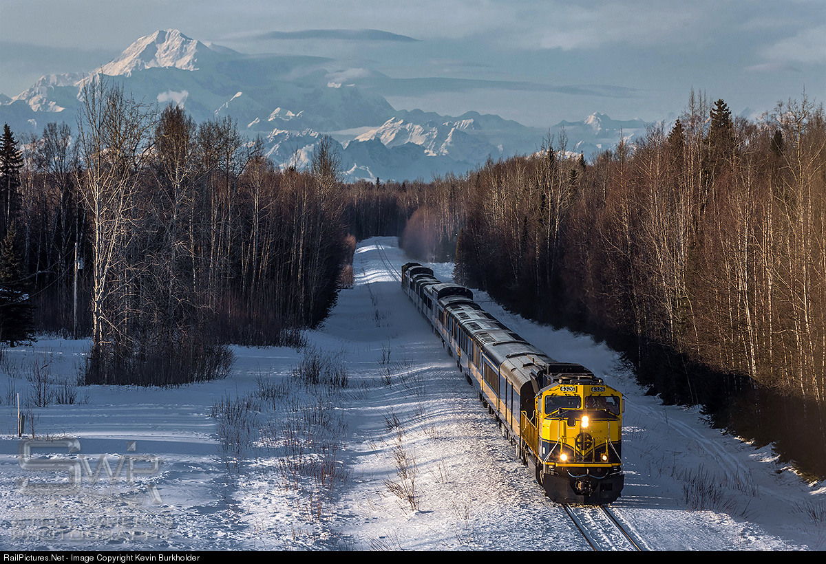 The longest passenger train of Alaska Railroad's annual operating season - the Nordic Ski Association charter train - operated on March 11, 2017, and is seen returning from their day stay at Curry, Alaska, heading back south for Anchorage with SD70MAC 4326 leading the trip back southbound as Denali looms ominous in the background...a rare occasion to see a mostly unobscured Denali.