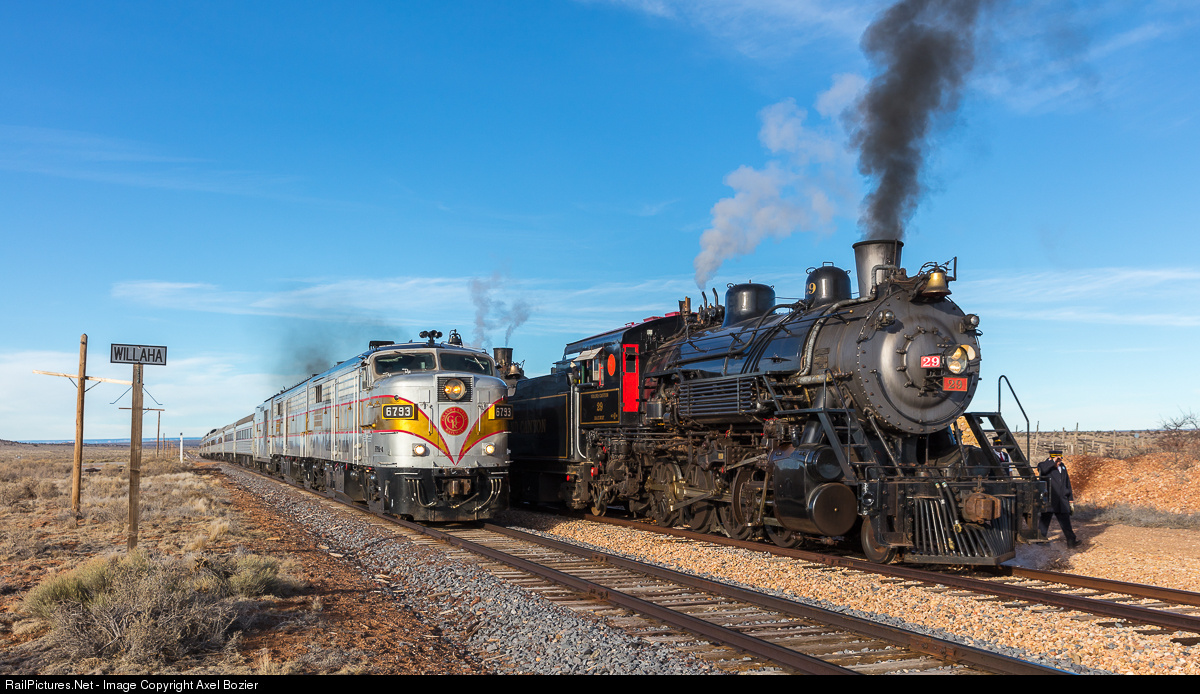 Two railway timeless beauties of the Grand Canyon Railway! The southbound "Grand Canyon Limited", pulled by the Montreal Locomotive Works FPA-4 (Alco Design) instead of the F40 locomotives (per request of Lerro Productions for a two-day steam photo charter on the GCRY), passes at full speed our steam train, led by the 2-8-0 engine #29, at Willaha, AZ. A great Lerro Productions Charter.