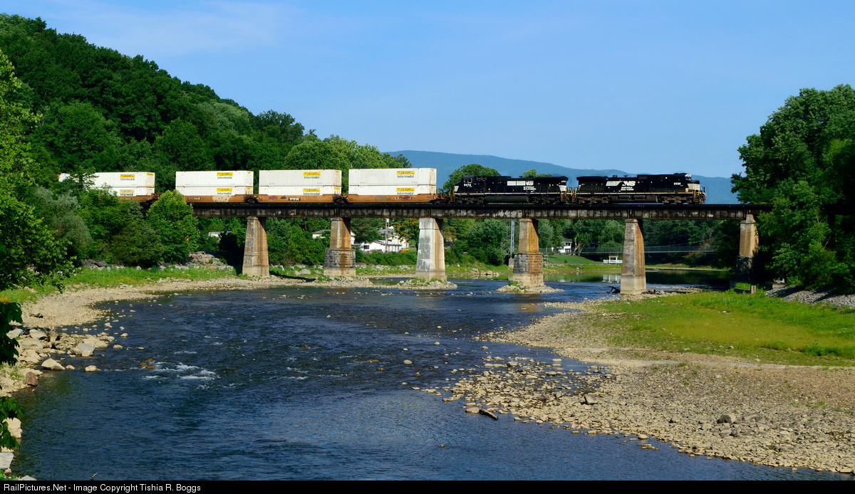 Norfolk Southern Corp "moves America" westbound across the Holston River through the community of Bluff City, Tennessee.