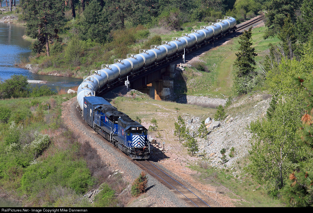 Montana Rail Link’s eastbound gas local crosses the Thompson River and passes milepost 26 near Woodlin (east of Thompson Falls), Montana, on May 6, 2012. EMD SD40 No 261 (rebuilt to a SD40-2XR), along with newer SD70ACe No. 4312, power the train along the Clark Fork on MRL’s Fourth Subdivision.