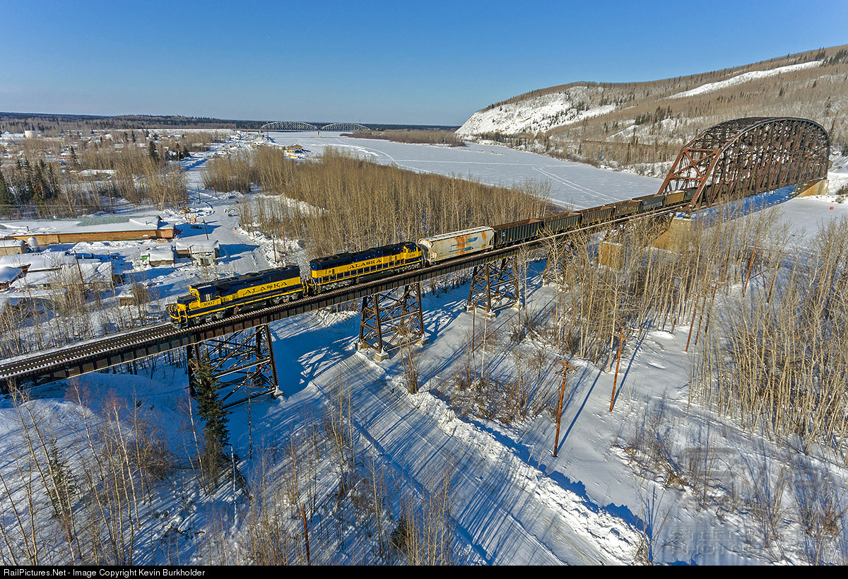 | Alaska Railroad train 188W is beginning to weave its way down to river floor level at Nenana, Alaska, as it crosses the Nenana River behind GP40-2 3007 and SD70MAC 4318. The train is enroute to Usibelli Coal Mine for loading, while the head car is for the rarely used Suntrana Branch near Healy. |