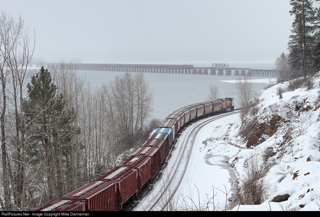 BNSF is experiencing a “grain rush” at the end of winter 2017. Here, a westbound grain train with lone DPU No. 4753 on the rear, has just cleared the long bridge over Lake Pend Oreille at Sandpoint, Idaho, as another westbound BNSF grain train follows close behind on the bridge. Before this westbound is on the curve in the foreground, an eastbound empty grain will have pulled up to the end of double track at West Algoma and occupy the track in the foreground.