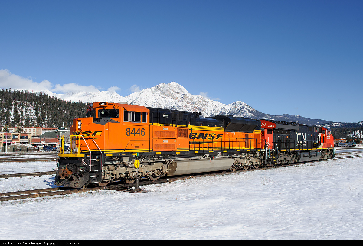| Looking very out of place, BNSF SD70ACe 8446 idles on the shop track in Jasper with CN ET44AC 3050. They ran an L513 Jasper-Swan Landing turn last night. |