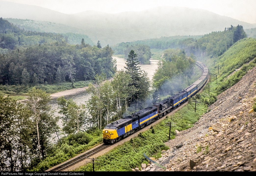 The Ocean, at speed in the Matapedia River Valley in Quebec Province, Canada. Eaatbound with lead unit MLW FPA-4, VIA 6786, taken from the shoulder of Rt.132.Train will shortly arrive at Matapedia station and set out some of its cars. These will become part of a waiting train and be forwarded to Gaspe behind a single RS-18. Any changes or attention to #14's power, will be carried out during the stop at Campbellton, NB.