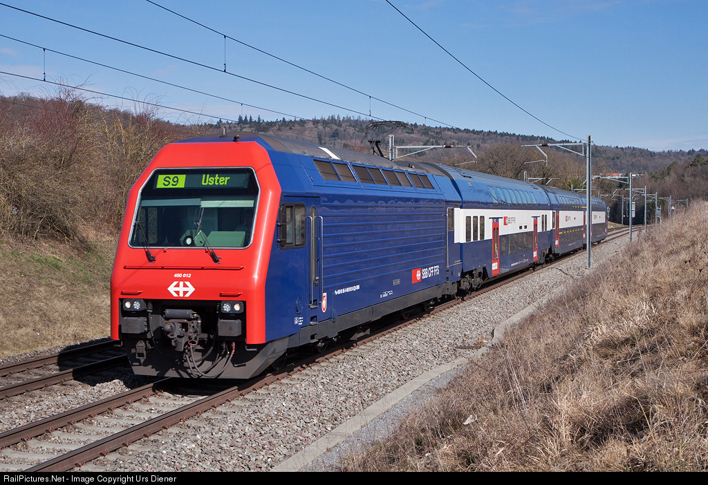 Doubledeck commuter train set with the leading locomotive Re 450 012 on the way from Schaffhausen to Uster.