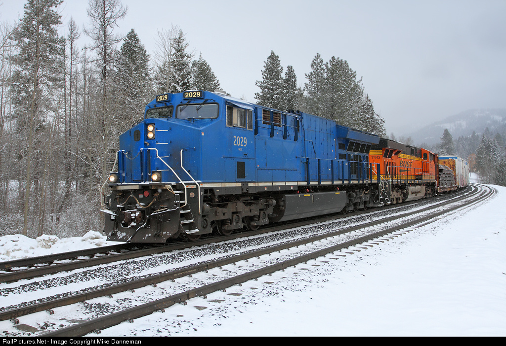 General Electric Leasing (GECX) ET44AC No. 2029 leads a westbound BNSF freight through Algoma, Idaho, on a snowy February 27, 2017. The locomotive is painted in a solid blue “demonstrator scheme” used on these early Tier 4 ET44ACs.