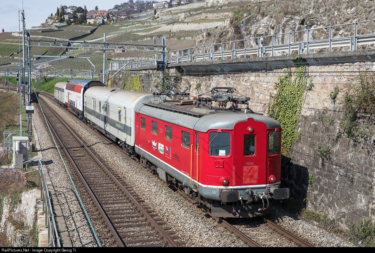 Former SBB Re 4/4 I # 10009, built in 1947 by SLM, BBC, MFO, SAAS), now TransRail Re 410 # 009, is running a transfer train of TransRail from Basel Bad Bf to Villeneuve along the shore of Lake Geneva near St-Saphorin. The new Twindexx double deck restaurant car WRB # 94 85 6 502 005, built by Bombardier Transportation in Bruge/Belgium, is framed by cars of RailAdventure company from Germany for the transport run (former baggage cars of the Deutsche Bahn).