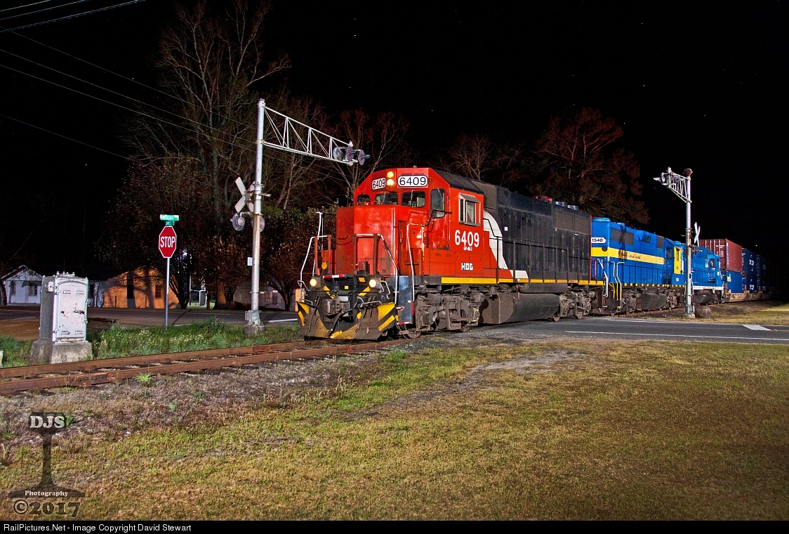 | The Heart of Georgia's eastbound Razorback steps through small town Higgston, Georgia as it nears Vidalia where a quick interchange will be made with GWI's Georgia Central which is coming north for the timed meet from Savannah. Tonight's eastward turn is lead by the HOG's former Detroit Toledo & Ironton GP40-2 409/GTW 6409/CN 6409. This scene is projected to be changed to GWI's orange and black by year's end since the HOG acquisition by GWI in early February. |