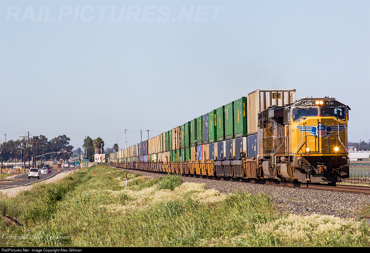 | In a rare turn of events, UP 4261 leads an empty double-stack container train down the ex-Southern Pacific coast line as it's seen here making the jaunt between Oxnard and Camarillo against the morning light. Sliding into the siding at Camarillo, the train would wait for the passage of Amtrak's northbound Coast Starlight before continuing south through Santa Susana Pass and into the Los Angeles basin. |