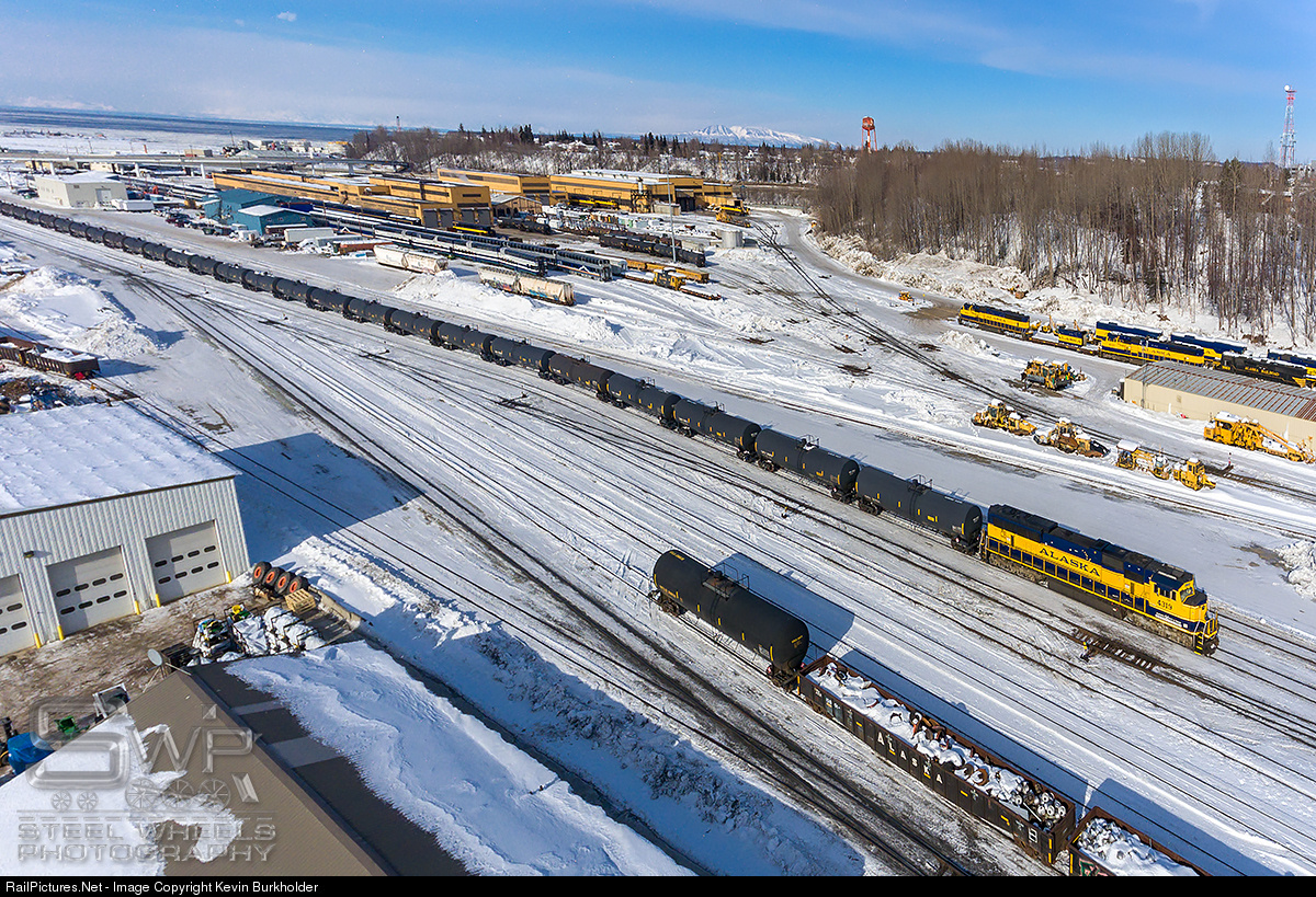 Alaska Railroad SD70MAC 4319 heads back to the Anchorage Yard from the port with a long string of tank cars. In the background is the Alaska Railroad shops and storage yard, where several cruise line passenger train sets can be seen stored, as well as current surplus motive power.