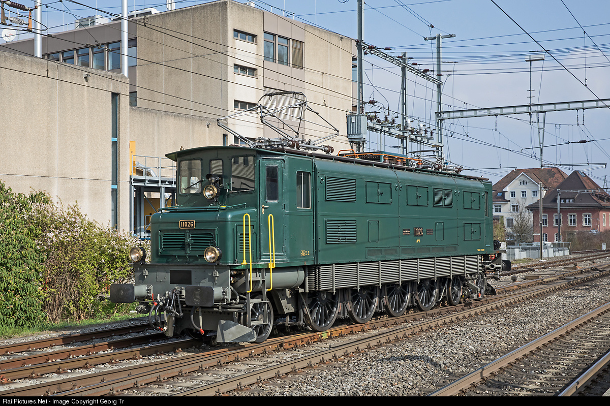On the occasion of the members' meeting 2017 of the association "Mikado 1244", the own Ae 4/7 # 11026 returned to the place where she was built in 1934 for the SBB. The mechanical part of this 2' Do 1' (or 4-8-2) express train locomotive for 100 km/h with Buchli drive was built in the SLM works in Winterthur, but all electric parts, wiring etc. was built in at Münchenstein in the Brown Boveri & Cie (former Alioth) plant. The locomotive # 11026 was withdrawn from service by the SBB in december 1996 (after 5,8 mio kilometer) and sold to ADtranz (successor of BBC), but donated to association "Mikado 1244" in 2001. Members of association Mikado 1244 made the technical and optical restauration to the "best looking Ae 4/7 of Switzerland".