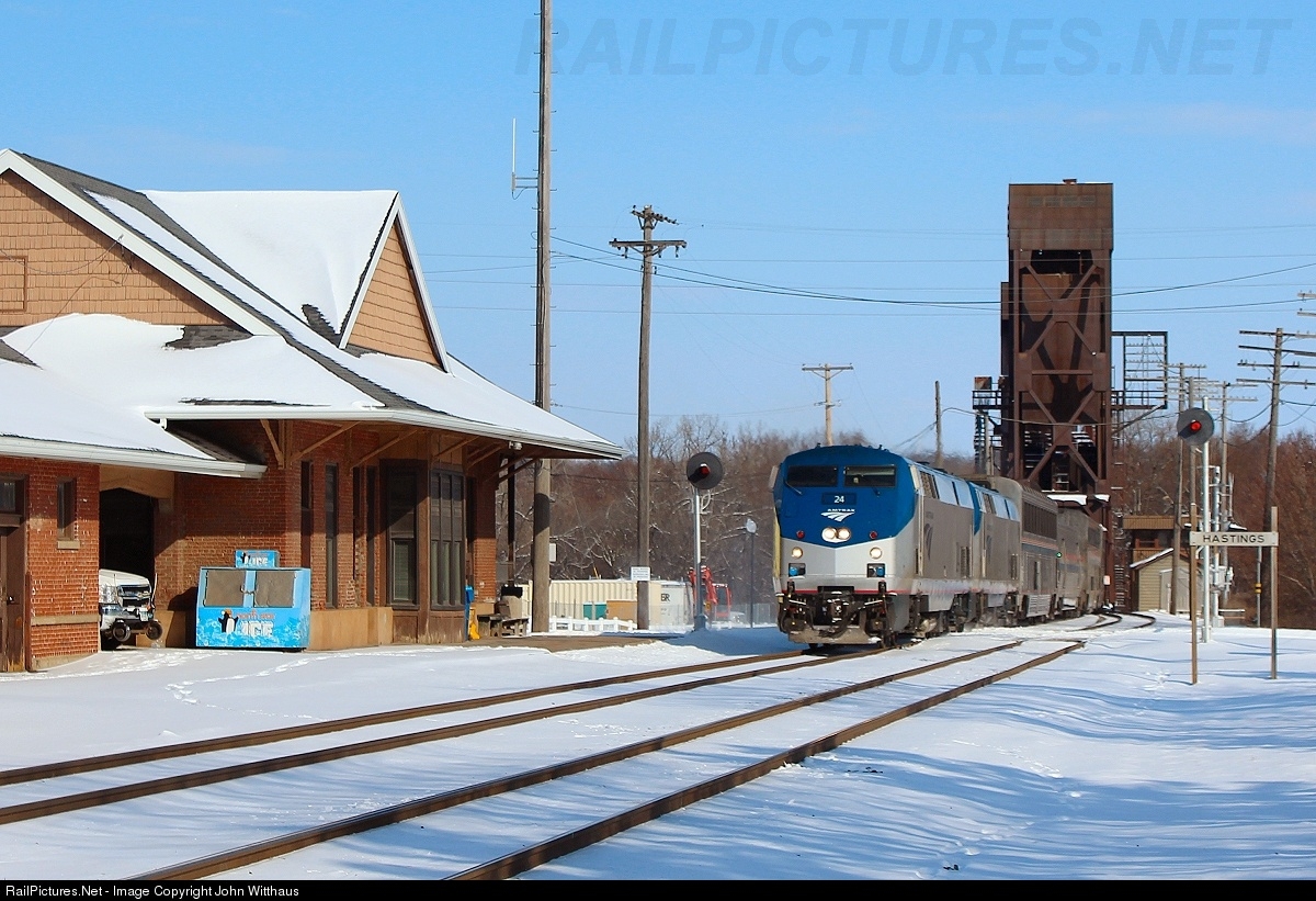 | Spring Snow Spring can sometimes throw weather curve balls in the upper midwest, a very late Empire Builder cruises past the CP Depot in Hastings after a mid-March snow storm. Amtrak had already been dealing with avalanches, and snow drifts out west this March. Taken while off duty, wearing full PPE. |