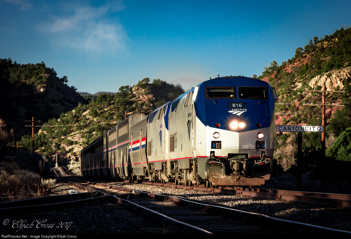 It's a beautiful early Spring evening; the sun is moments from setting, and the ever-growing shadows quickly consume the landscape. Running approximately 4 hours and 30 minutes late, Amtrak's Southwest Chief #3 makes a timely appearance as it descends Glorieta Pass and into Canyoncito, NM.