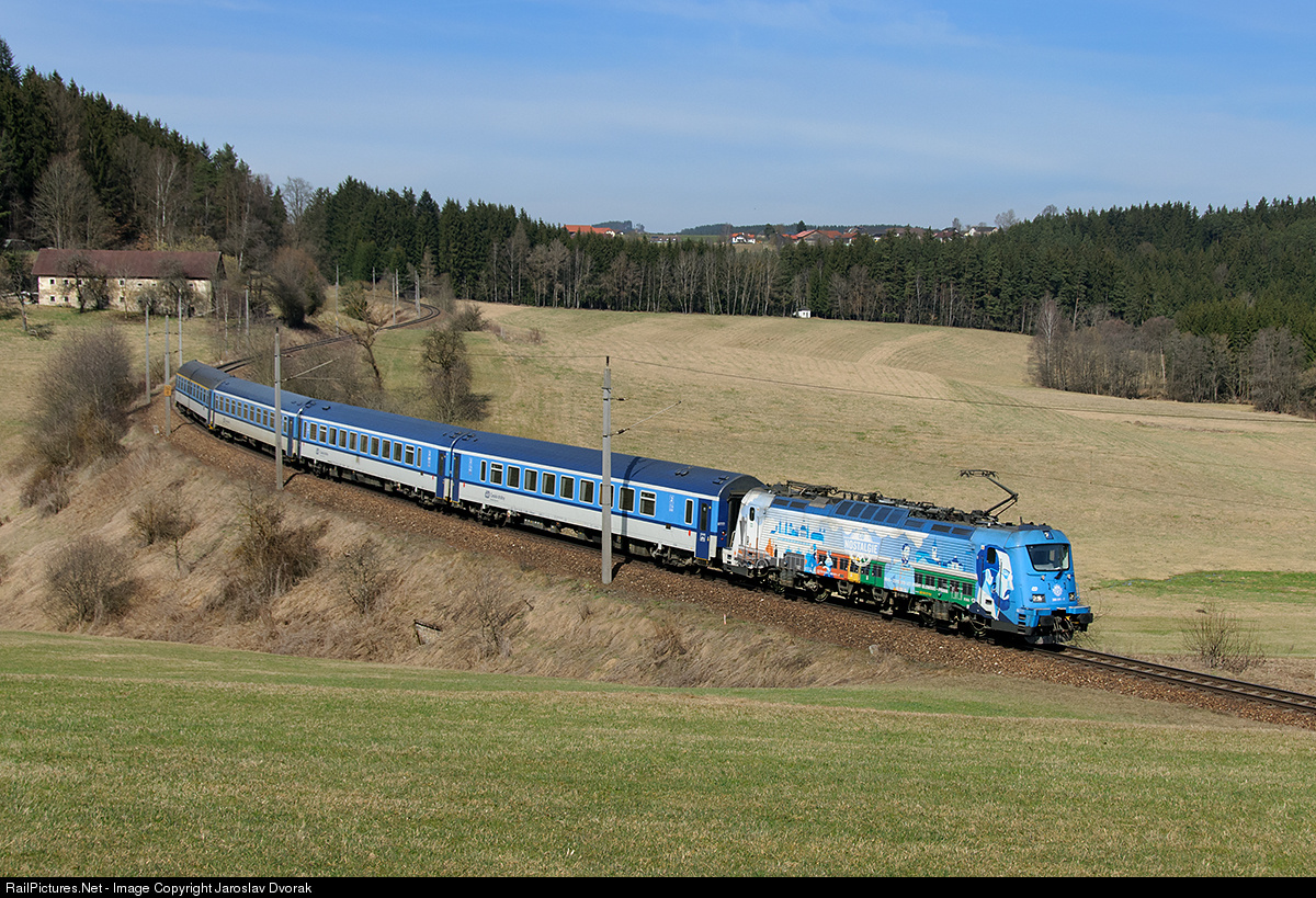| CZ / 196 Praha - Ceske Budejovice - Linz (Ex 1543 ANTON BRUCKNER). ČD 380 011-7 NOSTALGIE is focused on the 170th anniversary of the Prague - Olomouc and the centenary of the birth of Jana Pernera. |