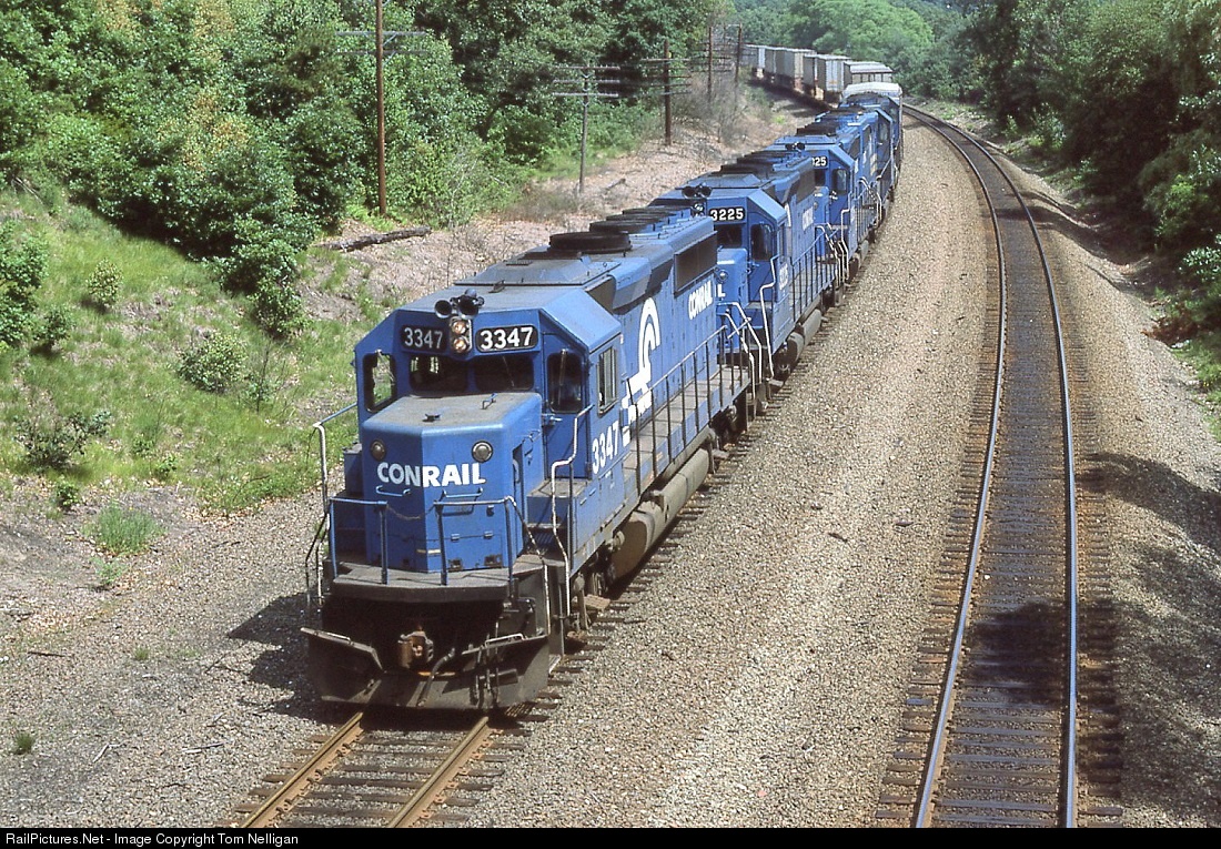 Conrail piggybacker TV-9 is roughly a dozen miles into its thousand-mile journey between Boston and Chicago as it swings through suburban Wellesley Farms, MA, behind a five-unit set of GP40-2s and GP40s. This was four-track territory in Boston & Albany days.