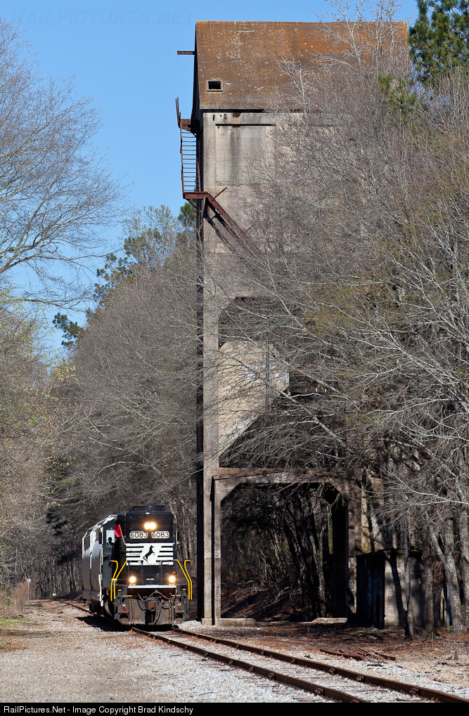 | Nearing the end of the line at Senoia, NS's G66 local is dwarfed by the massive Central of Georgia RR coaling tower where the line to Columbus split from the line to Griffin. |