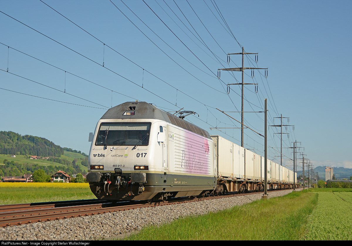| Re 465 017-2 "Pink Panther" BLS Cargo/railCare is pulling domestic freight of the railCare company. railCare is the associated distribution company of the Swiss retail trader "coop". |