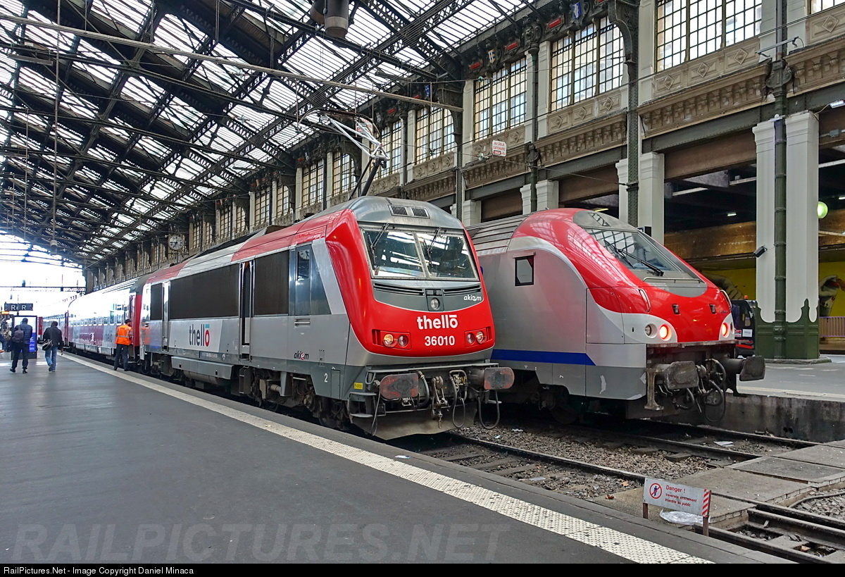 This left trainset is the first private passenger train in France. Thello Company is a join venture from French Veolia Transdev Company and public Trenitalia Company. The first travel of this train have been made on December 11th, 2011. Thello trains from Paris going to Venice in Italy. The BB 36010 is rented by Thello to Akiem SNCF subsidiary. Nicknamed "Astride" (ASynchrone TRI-system Drive Engine) this locomotive is a triple voltage (25 kV AC, and 3 and 1.5 kV DC) and can run in Italy. When powered by a 25 kV AC overhead supply, engines deliver about 5760 KW (7,720 hp). The right train is regional train who's going to Laroche-Migennes city in Bourgogne region.