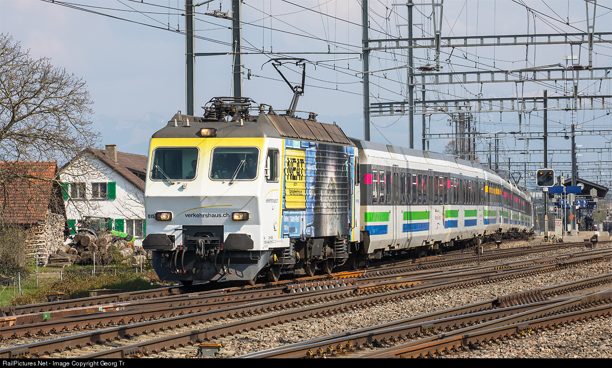 | Re 446 # 015 of the Südostbahn (SOB) with publicity paint scheme for Verkehrshaus (Swiss Museum of Transport) is pulling the Voralpenexpress VAE 2578 from St.Gallen to Lucerne, departing from Pfäffikon SZ. The 5050 kW locomotive for 160 km/h was built as Re 4/4 IV 10101 for the SBB in 1982 by SLM and BBC and was sold to the SOB in 1995. |