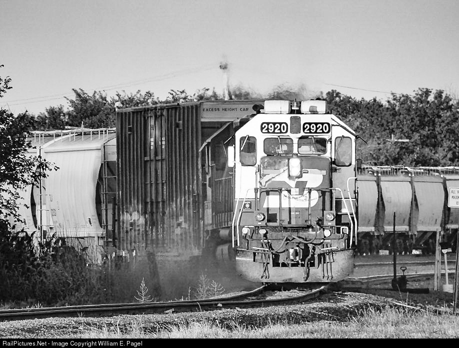 | Whiteface with a dark background. BNSF 2920 still in its BN Whiteface paint scheme pulls a cut of cars out of Eola yard in Aurora, IL. |