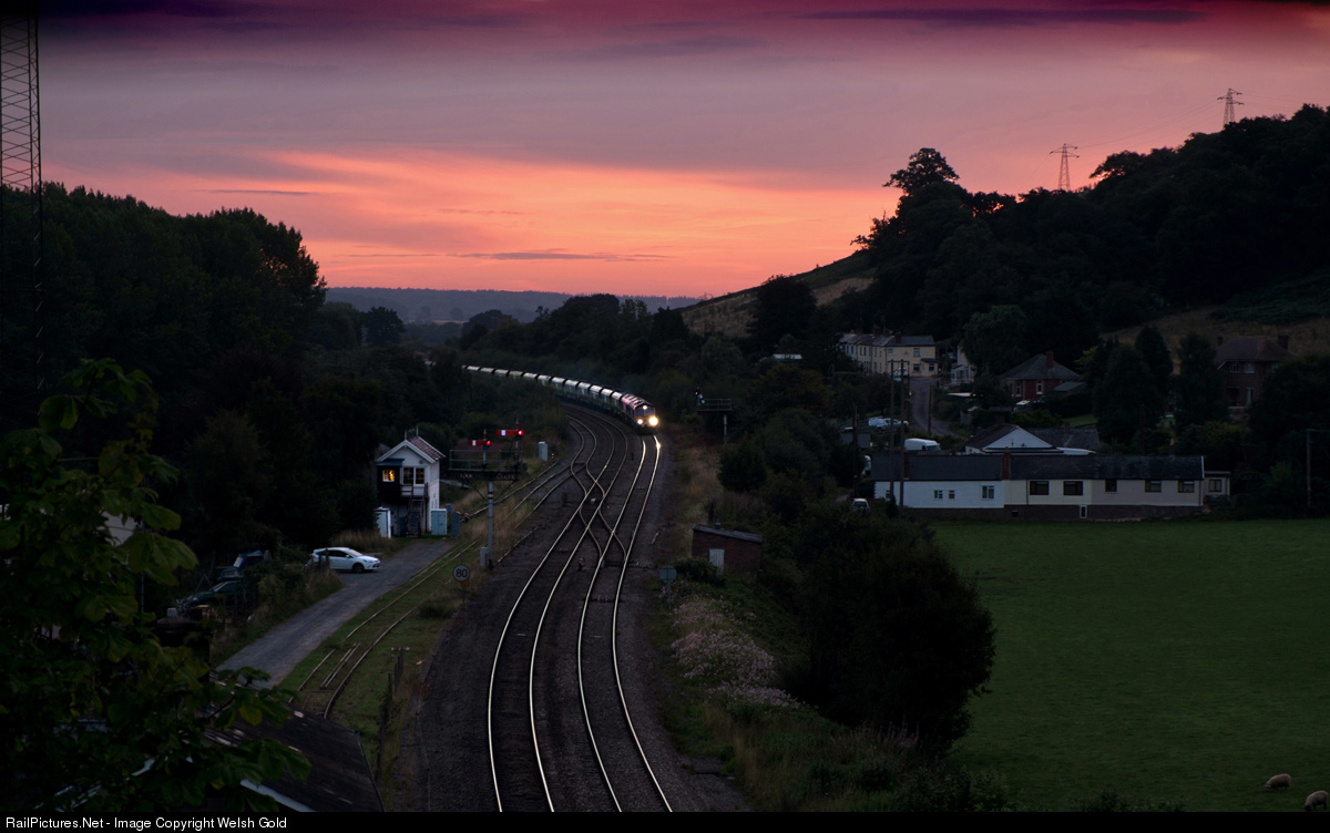 Red sky in morning, Sailor's warning! Well, that's the old adage anyway. Two unidentified Class 66 Freightliner locomotives head towards Pontrilas signal box near the England/Wales border in Herefordshire, working a south bound coal train with empty hoppers destined for Portbury from Rugely power station. Sadly, these coal workings have now stopped.