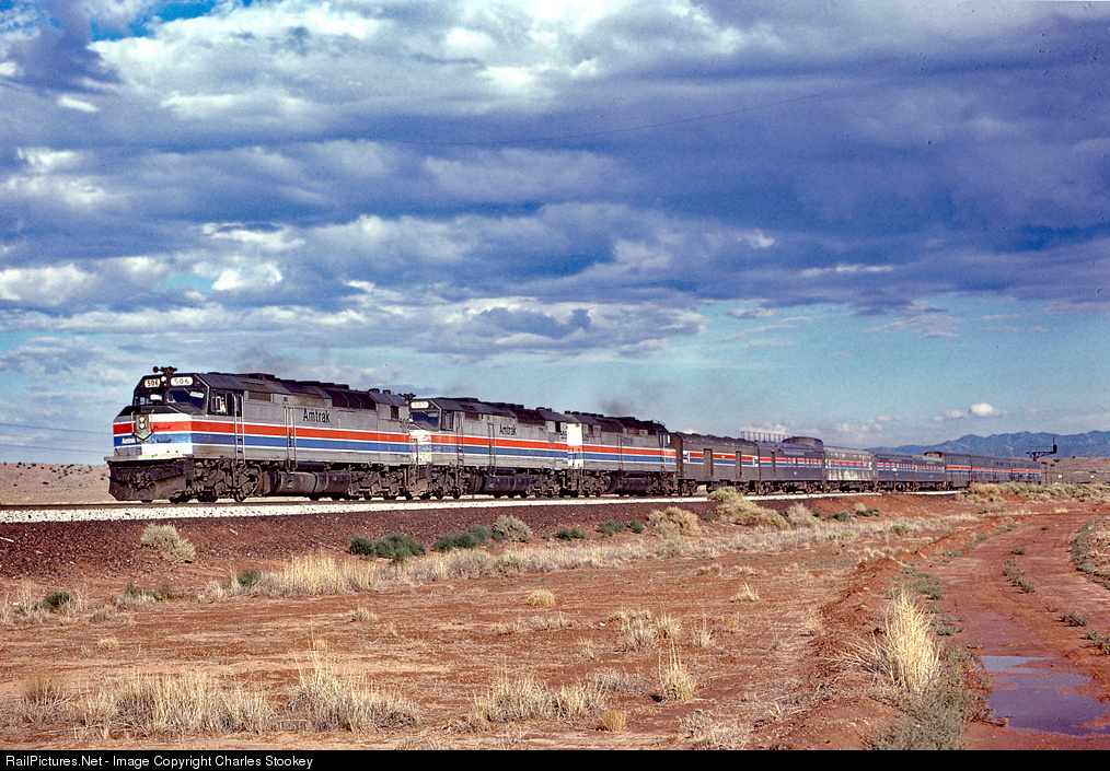 RIO PUERCO NM Sept 11 1980 -- Amtrak SDP40F 506 leads the Southwest Limited under New Mexico skies on Santa Fe's Transcon. When Amtrak took over the train from Santa FE it retained its Super Chief name. In 1974 Santa Fe decided Amtrak was not providing the correct level of service and required Amtrak to rename the train whereupon it became the Southwest Limited. In 1984 Santa Fe determined the level of service had improved enough to allow Amtrak to rename the train the Southwest Chief.