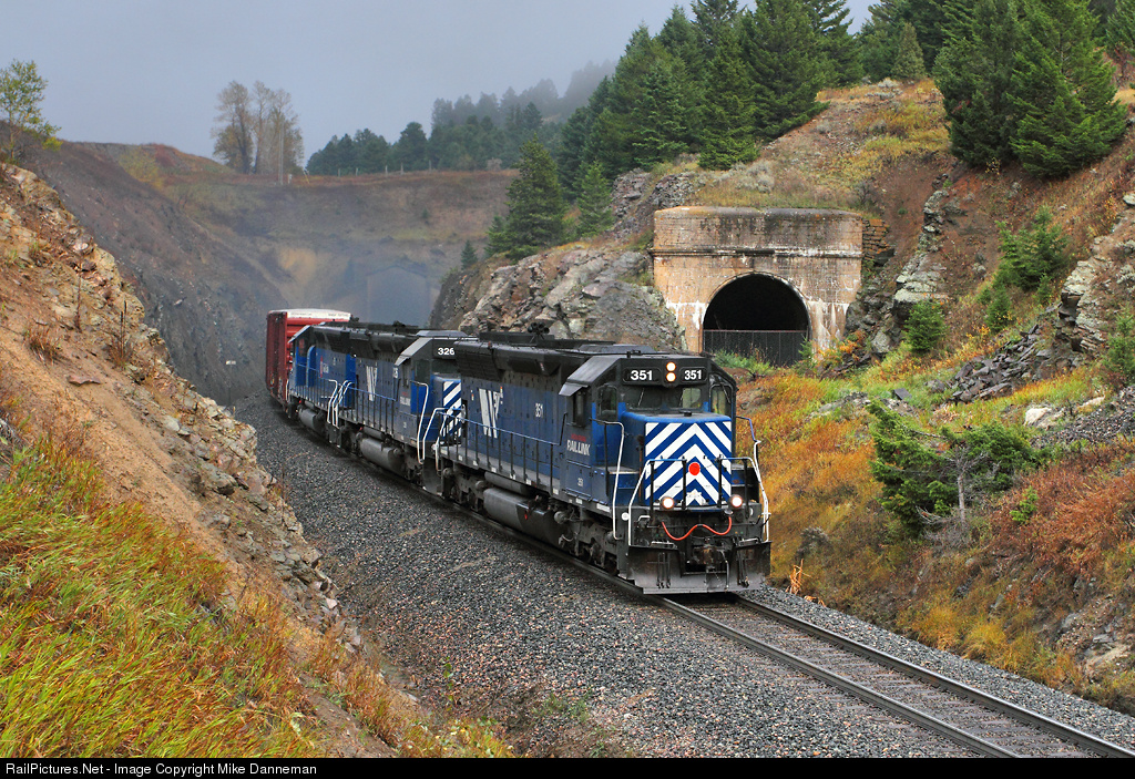 A westbound BNSF manifest freight powered by three Montana Rail Link SD45s crests Bozeman Pass at it exits Bozeman Pass Tunnel at West End, Montana, on September 28, 2014. The longer and more-restrictive original bore is on the right, and was bypassed when the new Bozeman Pass Tunnel opened for traffic on July 28, 1945.