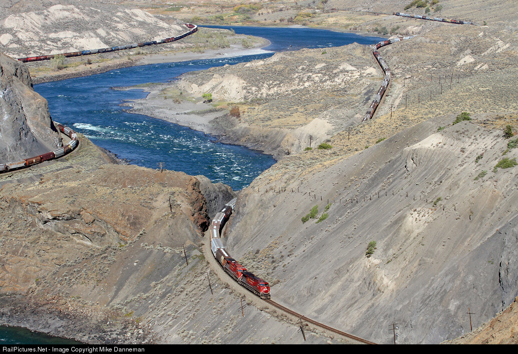 On September 24, 2015, a westbound Canadian Pacific grain train slinks though Black Canyon west of Ashcroft, British Columbia. On the other side of the Thompson River is an eastbound Canadian National freight.