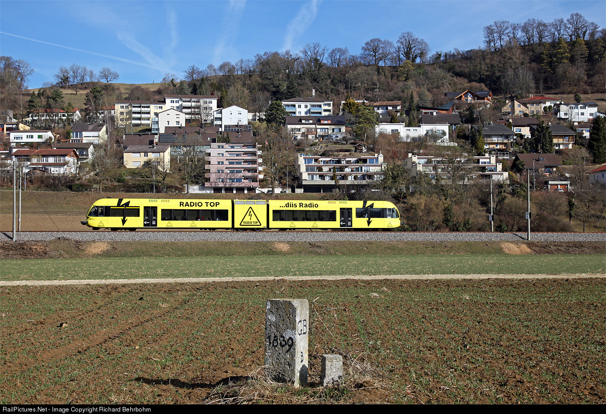 | RABe 526 707 of Thurbo has a publictiy paint for "Radio Top", a local radio station in Switzerland. In front there is an old borderstone Germany / Switzerland from 1839. |