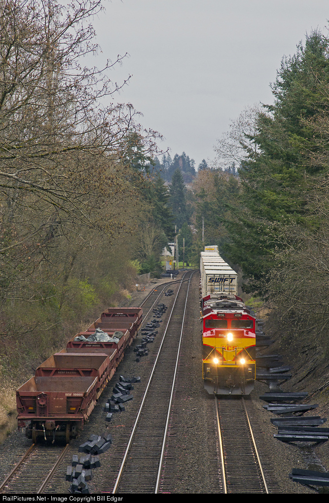 | Two hours at Titlow No. 6: KCS SD70ACe 4156 leads what appears to be the new Portland-Seattle-Texas Z train north on main 1 behind the two grain trains. The second unit was also KCS, a GEVO. What a treat in BNSF/UP country. By this time the sky was spitting rain, so off to the local tavern for a beer. While having a beer a northbound BNSF, UP and Amtrak went by. Seven trains in two hours. A nice day's outing. |