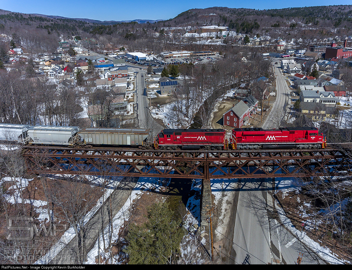 The Vermont Rail System's Green Mountain Railroad train #263 rolls high above downtown Ludlow, Vermont, on March 30, with VTR SD70M-2 431 and GP40-2W 310 heading up the short Thursday freight.