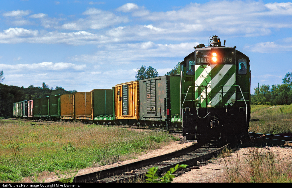 Burlington Northern GP9 No. 1916 leads a 14-car local around the wye at M&D Junction heading for a trip south on the former Northern Pacific “Skally Line” at White Bear Lake, Minnesota, in September 1984. This is home territory for the 1916, as it is former NP No. 331 built in 1957.