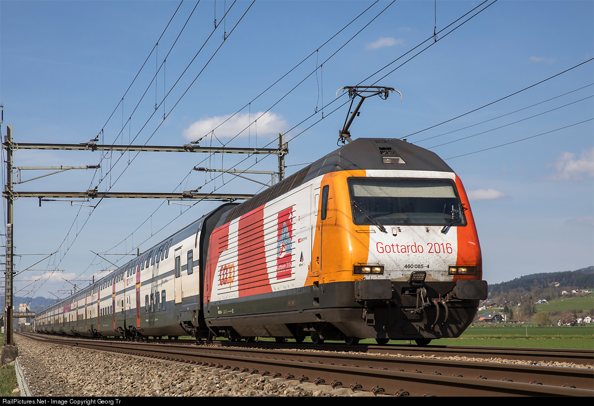 | Re 460 # 085 with publicity paint scheme "Gottardo 2016 Coop" is pulling the doubledeck "IC2000" Intercity 820 from Romanshorn to Brig through the Aare valley between Wichtrach and Kiesen towards the Lötschberg base tunnel. |