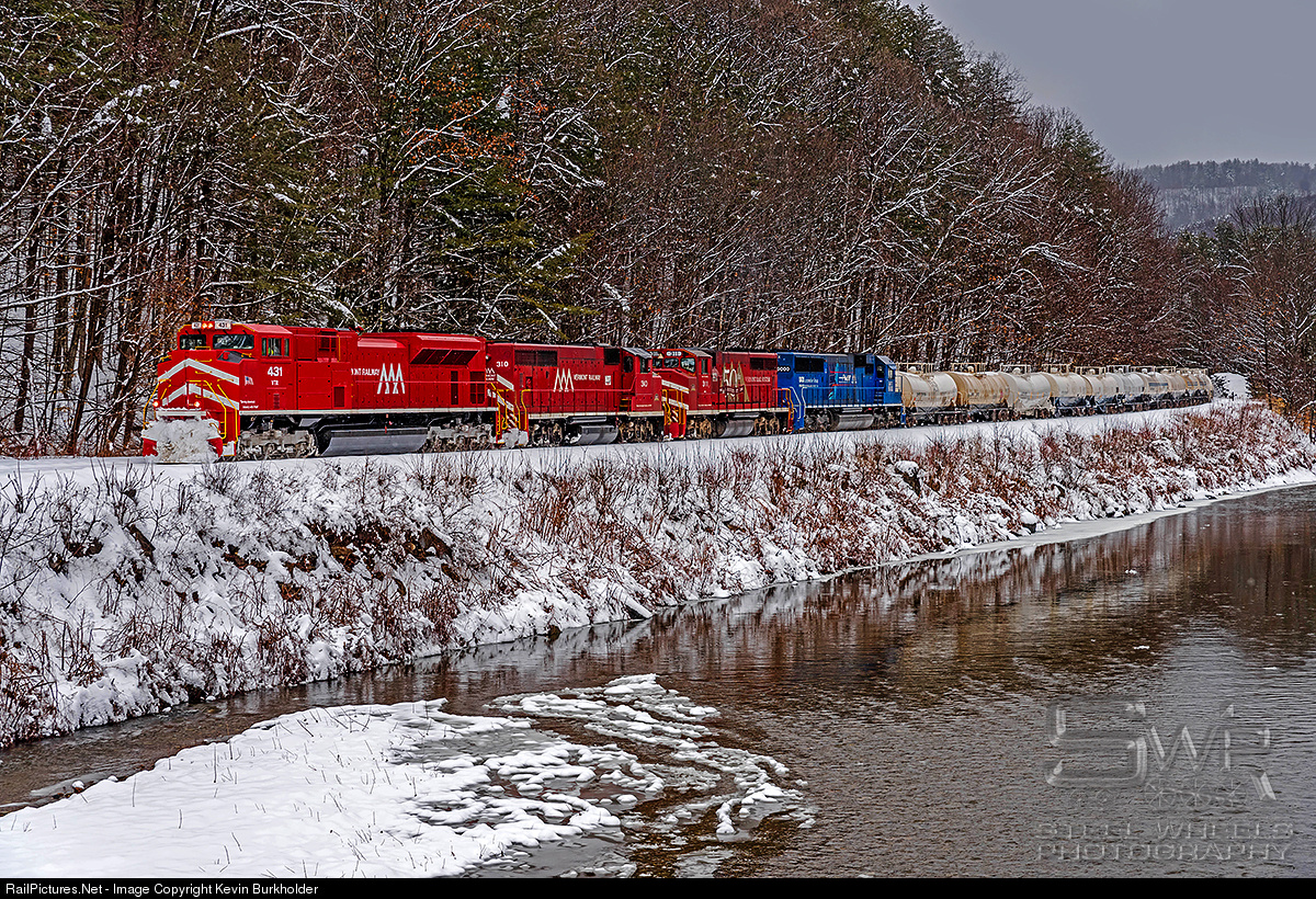| The Vermont Rail System's Green Mountain Railroad train #263x - the Saturday Slurry train - is seen traversing the Bellows Falls Subdivision after an April 1 snowstorm dumped as much as 14-18 inches of new snow on the eastern slopes of the Green Mountains. The train is seen along the Williams River at Bartonsville, VT with VTR SD70M-2 431 leading GP40-2Ws 310 and 311 with GMTX SD60 9000 - the P&W/VTR logo unit. |