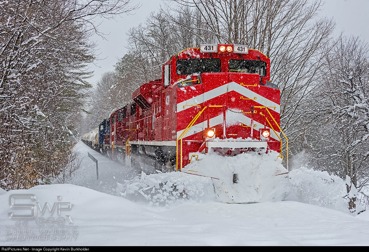 The Vermont Rail System's Green Mountain Railroad train #263x - the Saturday Slurry train - is seen traversing the Bellows Falls Subdivision after an April 1 snowstorm dumped as much as 14-18 inches of new snow on the eastern slopes of the Green Mountains. The train is plowing nearly 2 feet of snow as at heads through the Cavendish Gulf on the way to Gassetts, VT with VTR SD70M-2 431 leading GP40-2Ws 310 and 311 with GMTX SD60 9000 - the P&W/VTR logo unit. The 431 has signs of tree 'smacks' on the engineer side above the windshield and on the top of the nose.