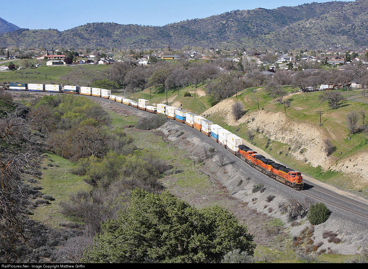 A trio of BNSF SD70ACe's lead a northbound stack train as it passes through Cable in the Tehachapi Mountains.