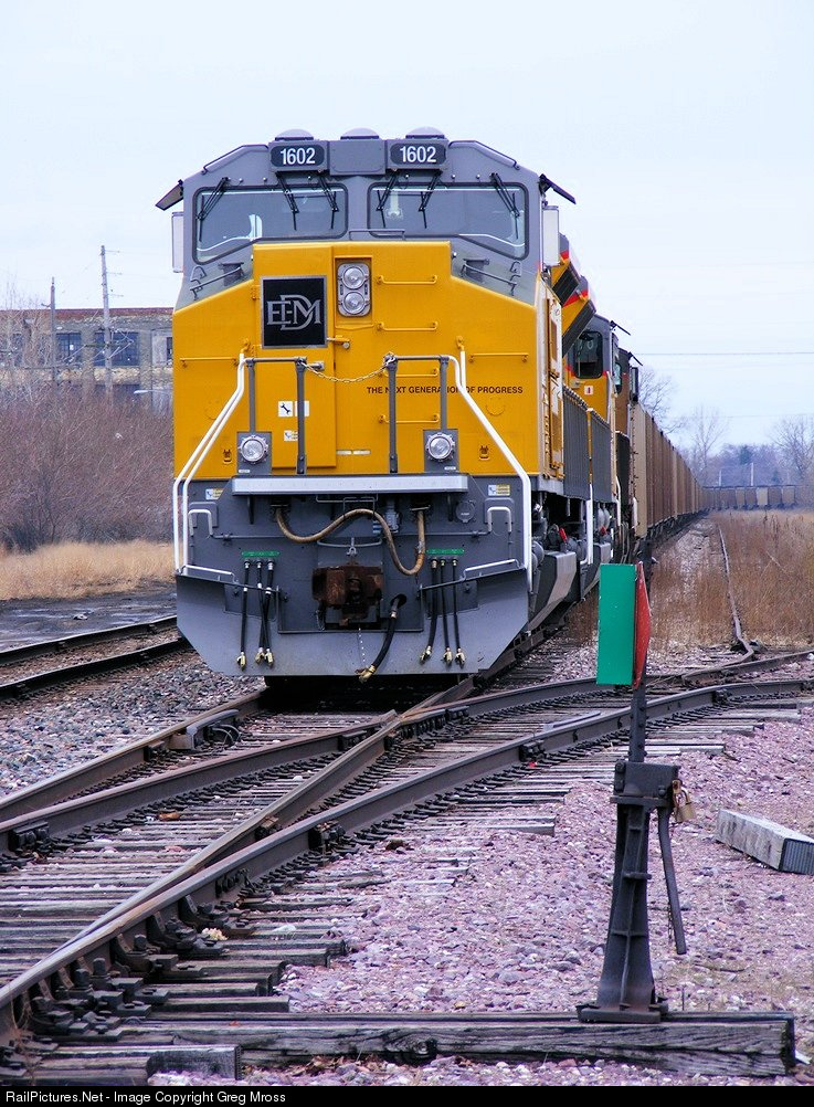 | EMD Tier 4 Demonstrators 1602 and 1601 await a crew in Racine, WI on April 4, 2017. They will take the train to the power plant for unloading. |