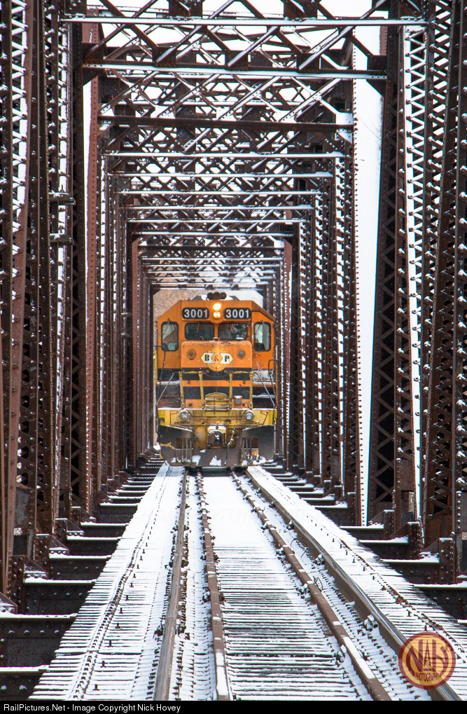 | On a snow-covered, frigid Warren winter morning, 3001 trails another Buffalo & Pittsburgh Geep on its way across the Allegheny River to United Refining. This single-track truss bridge once carried the Salamanca Branch of the Pennsylvania Railroad. The construction of the Kinzua Dam in the 1960's truncated the line on Warren's east side when construction was completed; the remnants of the branch now serve the refinery. |