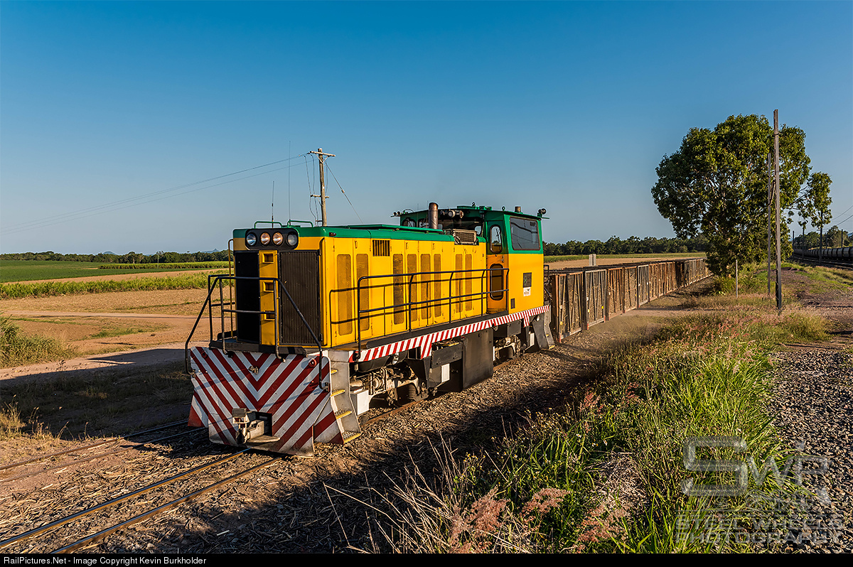 | On October 9, one of the afternoon 200-rake loaded sugar cane trains is heading north for the Plane Creek Mill at Sarina, Queensland, behind Walkser GH500 locomotive, #1 the "Allan Page" near Yukan. The train is making one of many trips collecting the rakes during the busy harvest season for Queensland sugar industry. |