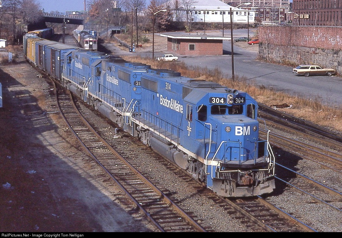 Carrying bridge traffic moving between Conrail at Rotterdam Jct., NY, and the Maine Central at Portland, ME, Boston & Maine train SEPO-B rolls through Lowell, MA, behind a GP40-2 trio. The modest brick building above the first unit was the city's commuter station at the time, and an MBTA commuter train waits in the distance.