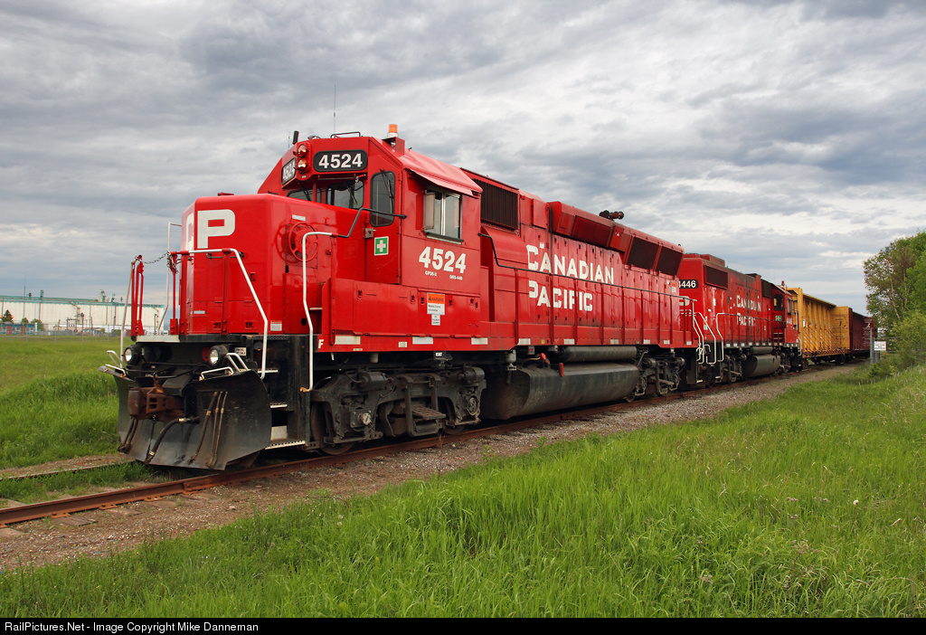 A Canadian Pacific switch job switches at the Port of Thunder Bay, Ontario, on June 12, 2016. Before being rebuilt into a GP38-2, CP No. 4524 was originally Union Pacific GP40X No. 9001, and the locomotive retains the unique flared radiators of the GP40X, but standard Blomberg B trucks have replaced the experimental high-adhesion HTB trucks.