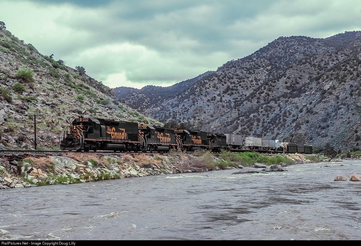 Rio Grande train 179, the Ford Fast Freight, grinds westward along the Arkansas River in Texas Creek, Colorado. Although the heart of the grade over Tennessee Pass is still about fifty miles ahead, the climb to get there has already limited this hot 59 car train to a pace that allowed several photo opportunities between here and Salida.
