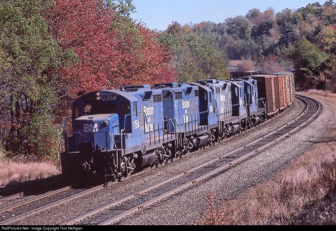 On a perfect fall afternoon, a quartet of Boston & Maine Geeps (GP18/GP18/GP9/GP9) works to lift westbound freight BASE (Bangor, ME, to Rotterdam Jct., NY via MEC/B&M) up the hill at Wachusett, MA. An MBTA commuter station has since been built at this location.