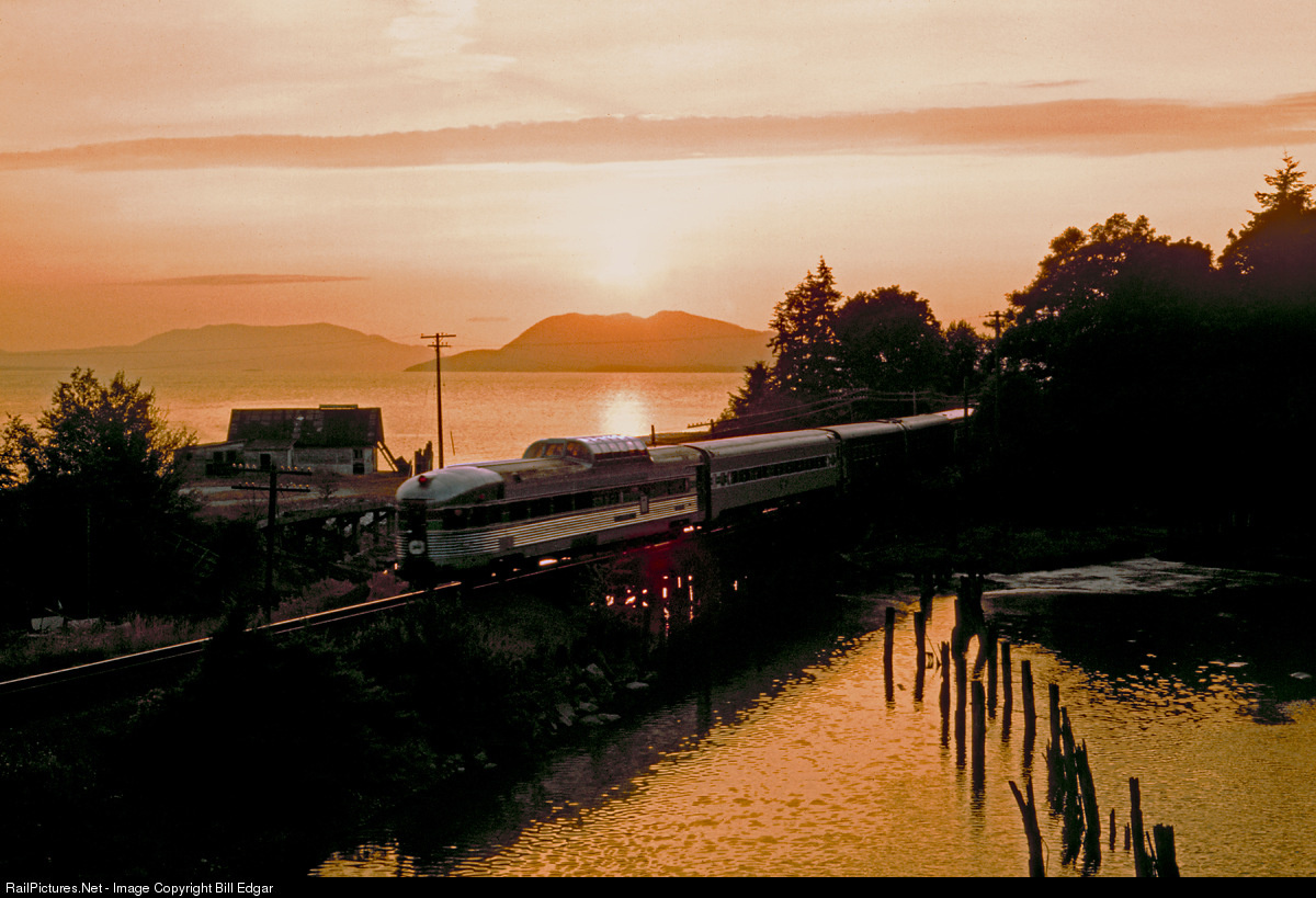 Amtrak's Pacific International heads north along Samish Bay about 20 minutes south of a station stop at Bellingham, WA on its run from Seattle to Vancouver, BC. During this time the train often featured a former Wabash dome observation car, and during the summer ran along the bay at sunset.